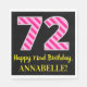 Este divertido design de guardanapo de papel, tema de aniversário, apresenta um grande número de "72" com um padrão cor-de-rosa escuro e listras de rosa claro, juntamente com a mensagem "Feliz 72º aniversário", e um nome personalizável. O fundo é preto colorido. Alguns guardanapos de papel personalizados e divertidos como este podem ser usados numa festa que está sendo realizada para celebrar o setenta e segundo aniversário de alguém. [~Z0000380]