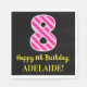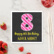 Este divertido design de guardanapo de papel, tema de aniversário, apresenta um grande número "8" com uma rosa claro e um padrão de listras cor-de-rosa-escuro, juntamente com a mensagem "Feliz 8.º aniversário", e um nome personalizável. O fundo é preto colorido. Divertidos, personalizados guardanapos de papel temáticos como este podem ser usados na oitava festa de aniversário de alguém. [~Z0000380]