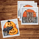 Este desenho gráfico, foi digitalizado, na edição de fotos, para criar esta vibrante, laranja-amarela, lua com morcegos voando, em uma cinza pálida, colorida, céu e exibida, com uma saudação gótica familiar, "Feliz Dia das Bruxas"!