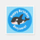 Uma baleia assassina feliz e faminta está nadando no oceano. Desenhado no estilo de ilustração de desenho animado em um fundo azul para uma celebração divertida!