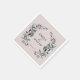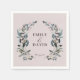 guardanapo personalizado com seus nomes e data especial, enquadrado por folhas e florais de cor aquosa em tons azuis e cor-de-rosa.