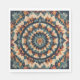 Um padrão de colcha geométrica vibrante irradia do centro, criando uma intrincada design de mandala com várias cores, incluindo tons de verde-lacrimejo, marrom-ferrugem e bege