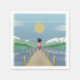 Uma ilustração de uma mulher correndo ao longo de um cais pronto para pular no lago Rotoiti. Este é um lago no Parque Nacional dos Lagos, na Ilha do Sul, Nova Zelândia. Desenhado em um estilo de arte retrô-pop, este design tem a aparência de papel dobrado e vestido.