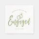 Um guardanapo com letra de roteiro divertido e único, feito sob medida especificamente para a sua festa de engajamento. Apresenta a palavra 'engajados' com alianças de casamento repousando sobre ela. Abaixo e acima disso estão os nomes da noiva e do noivo e a data do noivado.