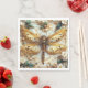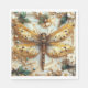 Guardanapos de papel bonitos com uma imagem de uma libélula dourada metálica contra um fundo de concha branca, adornada com flores, pérolas, contas e gemas.