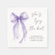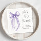Guardanapos elegantes para o seu chá de noiva que apresentam uma aquarela pintada à mão de um laço de coquete roxo, "Ela está dando o nó" em uma fonte caligráfica chique e o nome da noiva e a data do chá em letras modernas simples.