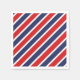 Guardanapo de papel para festa é mostrado no tamanho coquetel branco com uma impressão de listras vermelhas, brancas e azuis.