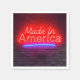 Um sinal de neon brilha com as palavras "Made In America" em vermelho e azul a negrito contra uma parede de tijolos