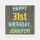 Este design de guardanapo de festa de aniversário divertido apresenta uma mensagem como "FELIZ 31º ANIVERSÁRIO, JENNIFER!", onde o nome pode ser personalizado. O fundo apresenta um padrão de aparência rústico, castanho e falso em grãos de madeira. O texto de mensagem personalizável apresenta cores como azul, amarelo e verde, e tem uma aparência inspirada pela de letras pintadas e estêncilhadas. Napkins como estes poderia talvez ser usado numa festa de aniversário para alguém que comemora seus trinta anos de primeiro aniversário. [~Z0000292]