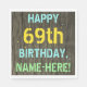 Este design de guardanapo de festa de aniversário divertido apresenta uma mensagem como "FELIZ 69º ANIVERSÁRIO, NOME AQUI!", onde o nome pode ser personalizado. O fundo apresenta um padrão de aparência rústico, castanho e falso em grãos de madeira. O texto da mensagem personalizada apresenta cores como azul, amarelo e verde, e tem uma aparência inspirada pela das letras pintadas e estêncilhadas. Napkins como estes poderia talvez ser usado numa festa de aniversário para alguém que comemora seu sexagésimo nono aniversário. [~Z0000292]