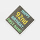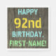 Este design de guardanapo de festa de aniversário divertido apresenta uma mensagem como "FELIZ 92º ANIVERSÁRIO, PRIMEIRO NOME!", onde o nome pode ser personalizado. O fundo apresenta um padrão de aparência rústico, castanho e falso em grãos de madeira. O texto de mensagem personalizável apresenta cores como azul, amarelo e verde, e tem uma aparência inspirada pela de letras pintadas e estêncilhadas. Napkins como estes poderia talvez ser usado numa festa de aniversário para alguém que comemora seu nonagésimo segundo aniversário. [~Z0000292]