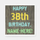 Este design de guardanapo de festa de aniversário divertido apresenta uma mensagem como "FELIZ 38º ANIVERSÁRIO, NOME AQUI!", onde o nome pode ser personalizado. O fundo apresenta um padrão de aparência rústico, castanho e falso em grãos de madeira. O texto da mensagem personalizada apresenta cores como azul, amarelo e verde, e tem uma aparência inspirada pela das letras pintadas e estêncilhadas. Napkins como estes poderia talvez ser usado numa festa de aniversário para alguém que comemora seus trinta e oito anos de aniversário. [~Z0000292]