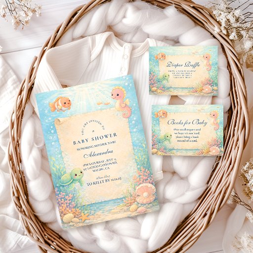 A charming under-the-sea design featuring sweet ocean animals like a whale, seahorse, turtle, and octopus, floating among coral, bubbles, and soft underwater light. Illustrated in a gentle storybook style with calming blue and aqua tones, this design feels playful yet soothing — perfect for a whimsical ocean-themed celebration. Ideal for parents who love nautical themes, sea life, and soft fantasy aesthetics. All text is fully customizable to match your special event.