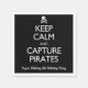 O tema Pirate design apresenta uma velha imagem de bandeira pirata de um crânio e ossos cruzados junto com uma tomada dos antigos posters Britânicos Keep Calm. Este aqui diz "Manter Calmo e Capturar Piratas" - perfeito para o Halloween, falar como um Dia Pirata ou qualquer festa de aniversário temática pirata ou outro evento pirata.