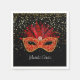 Este guardanapo de papel é mostrado a preto em um guardanapo branco com estrelas de ouro e um festivo impressão de máscara de carnaval Mardi Gras. Personalize este item ou comprar como está.