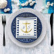 As listras azuis náuticas clássicas de marinho náutico formam a base desta design náutica de casamento. Uma âncora de ouro no centro é flanqueada pelos monogramas da noiva e do noivo. Veja o resto da coleção de temas de casamento.