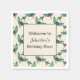Este guardanapo de papel com uma vibração retroativa pode ser personalizado para qualquer festa ou evento. O design apresenta um padrão influenciado por Meio século de gráficos simples de palmeiras em laranja e verde em torno de um oásis em forma de bumerangue ou piscina de natação em um azul-aqua vívido. A cor de fundo da areia pode ser editada.
