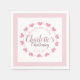Menina batizando guardanapos em branco com uma borda rosa. O design mostrado inclui pétalas cor-de-rosa num anel e espaço para o nome da criança, bem como a sua data de batização. Para personalizar o texto mostrado, use o botão personalizar. Também estão disponíveis pratos de papel e xícaras para batizar comemorações e festas.