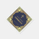 Este elegante desenho religioso em azul-marinho e dourado com um ar vintage, recomendado para um menino, tem uma moldura ornamentada em folha de ouro falsa com elegantes decorações barrocas sobre um fundo azul-marinho. Acima do texto há uma cruz religiosa em folha de ouro falsa. A ocasião também está em folha de ouro falsa; o restante do texto tem uma cor dourada semelhante à moldura de ouro falsa.