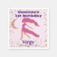 Virgo divertido pintado em estilo impressionista. A garota tem o cabelo, o vestido e os pés mastigados com nuggets de ouro. Ela está vestindo uma pulseira de ouro. Há também uma lua rosa dourada. O confete dourado aleatório é exibido ao redor do texto e da foto. As cores utilizadas são cor-de-rosa profundo e rosas claro. O texto está escrito em roxo escuro. O fundo é rosa claro. Você pode alterar as cores do texto e do plano de fundo com ferramentas do Zazzle.
