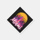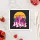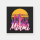 Ilustração do design de texto "Miami" no estilo retrô com decoração de solários e arranha-céus em rosa, amarelo e roxo