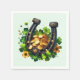 Guardanapos de papel com uma Rua. Imagem temática do Dia de Patrick. Uma ferradura preta e dourada sentada numa cama de trevo verde com moedas de ouro brilhante.