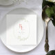 Elegante e chic. Estes adoráveis guardanapos de casamento excluem uma frescura jovem. As iniciais do casal em um conjunto de cores cor-de-rosa-coral dentro a um delicado quadro verde floral. Os nomes de casais e a data são expressos em uma rica cor verde-escura da floresta contra um fundo branco.