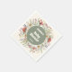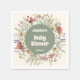 Mushroom Baby Shower paper napkins featuring a whimsical watercolor wreath of red toadstool mushrooms, wildflowers, lavender, and soft greenery with an earthy sage center. Cute tablewear and charming party decorations for a forest mushrooms themed baby shower, perfect for a Whimsical, cute, Earthy Baby celebration. Personalized in honor of the mom-to-be with her name and shower date - ideal for dessert tables, drink stations, brunch spreads, and a cozy woodland/boho rustic baby shower setup.