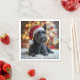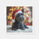Um cachorro negro escocês aterrorizante vestindo um chapéu de Papai Noel se senta em um tapete liso em frente a uma festiva árvore de Natal enfeitiçada com luzes.