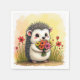 Um ouriço fofo segura um buquê vibrante rodeado por florescentes flores vermelhas.