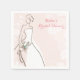 Um guardanapo bonito de papel chá de panela com um esboço de noiva de vestido branco com buquê sobre fundo cor-de-rosa pincelado com um círculo aleatório.