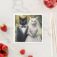 Dois gatos estão vestidos com trajes de casamento, um com um smoking e o outro com um vestido de noiva segurando um buquê