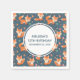Feliz guardanapo de papel de aniversário com um padrão feito com raposas de laranja bonitinhas e felizes. Fundo verde escuro. Pequenos cogumelos e folhas espalhados. Um círculo branco em camadas sobre o topo com sua dentro de texto personalizada.