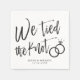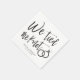 Um guardanapo com roteiro divertido e único personalizado especificamente para você em uma festa pós-nupcial. Nele estão as palavras "Nós Amarrámos" com alianças de casamento sobrepostas. Abaixo e acima disso estão os nomes da noiva e do noivo e a data do casamento.