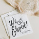 Um guardanapo com letra personalizada divertido e único, feito sob medida para você, para uma festa pós-casamento. Ele apresenta a palavra "noiva" com os anéis de casamento repousando sobre ela. Abaixo e acima disso estão os nomes da noiva e do noivo e a data do noivado.