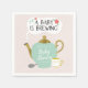 Jogue um chá de fraldas fabuloso com este guardanapo de papel tema do chá de chá! Ilustração de um pote de chá verde de menta com o texto acima que diz "A BABY IS BREwing." Há também flores rosa-coral. Personalize este produto adicionando o nome e a data do evento da mamãe.