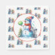 Os guardanapos de papel da festa de Natal. Arte temática de golfe de disco. Homem-neve bonitinho de aquarela em Santa que fica ao lado de um cesto de golfe de disco na neve ao lado de uma árvore de Natal.