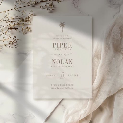 OASIS Coastal Beach, paper wedding napkins. Features, taupe typography and palm tree illustration.