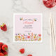 Celebrate your little one with this sweet “Our Little Wildflower” 1st birthday party napkins Sign, featuring a soft pink background and a charming border of colorful wildflowers and buzzing bees along the bottom. Your child’s name is displayed in a beautiful script font in a coordinating floral shade, while the party details are set in an elegant serif font for a timeless touch. Designed to be easy to customize, this napkin is as practical as it is adorable.