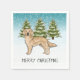 A ilustração original do desenho animado de Destei de um cão da raça Retriever, Ouro de cor amarela, bonito. O cão é colocado numa cena de inverno com três árvores de abeto verde e neve caindo. O fundo é um gradiente azul a branco que dá à design aquele olhar frio do dia de inverno. Há também uma área de texto personalizável que agora diz: "Feliz Natal!".