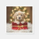 Um filhote de Retriever de Ouro bonito sai de uma caixa vermelha de presentes adornada com uma fita ouro, colocada contra um pano de fundo de luzes festivas e desfocadas de Natal.