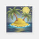 The image depicts of a small tropical island with two palm trees. The island is in the middle of a body of an ocean or sea, under a clear sky with the sun setting or rising in the background. The colors are vibrant, with yellow sand, green palm leaves, blue water, and a gradient sky from blue to yellow around the sun. A imagem mostra uma pequena ilha tropical com duas palmeiras. A ilha está no meio de um corpo de água, um oceano ou mar, sob um céu limpo com o sol se pondo ou nascendo ao fundo. As cores são vibrantes, com areia amarela, folhas verdes de palmeira, água azul e um céu gradiente do azul ao amarelo ao redor do sol.