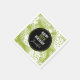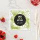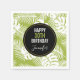 Guardanapos de festas com um padrão repetitivo de folhas de palma grandes sobre um fundo verde-oliva. Um círculo preto com uma borda dourada colocada sobre cima com seu dentro de detalhes personalizados de aniversário.