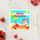 Esta festa de Natal Feliz, guardanapo design, mostra Santa Clause na praia. Ele está relaxando desfrutando do sol, palmeiras, seu cano e alguns pássaros de inverno engraçados.