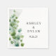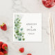 Este guardanapo de papel de casamento é mostrado com uma impressão de folhas de vinho de eucalipto. Personalize este item e altere o texto do exemplo para o seu. Imagem licenciada