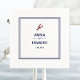 Naufrágio de lavagante com nomes de noiva e noiva e data de casamento dentro de uma fronteira dupla. Branco com texto azul marinho em bloco e script, rumo da lagosta de marrom e borda azul marinho em fundo branco.