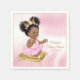 Guardanapos de chá de bebê da princesa afro-americana com adorável bebê negra com rabos de cavalo fofos usando uma linda corrente de pérolas e coroa rosa e dourada sentada em uma almofada dourada em um belo fundo rosa e dourado. Esses guardanapos de chá de bebê da princesa rosa e dourada são facilmente personalizados para o seu evento, basta adicionar o texto de sua escolha. Você também pode remover o fundo e adicionar a cor de sua escolha.