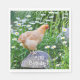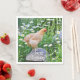Estes guardanapos de frango de aniversário apresentam um belo buff orpington frango parado num cogumelo de madeira cercado por um jardim de margaridas.