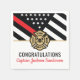 Este design apresenta uma bandeira de bombeiros com listras pretas e brancas, e uma fina faixa vermelha também. "Parabéns" e o texto do crachá do bombeiro fica acima do nome do bombeiro, tenente ou chefe que se formou ou se aposentou. Celebre em estilo!