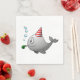 Fragmentos de aniversário de piscina com uma bela ilustração de uma baleia. A baleia está vestindo um chapéu de festa listrado vermelho e branco e começou a festa de aniversário.
